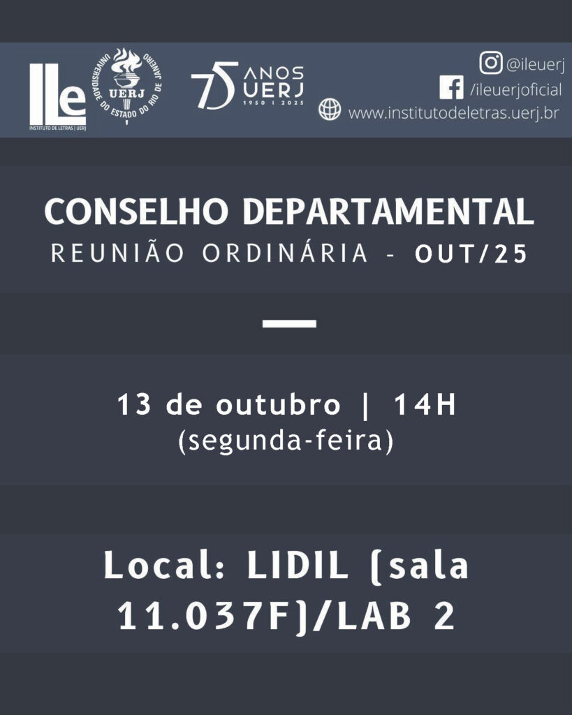 Publicado por Michelle Saab em 02/10/2025 Data: 13 de outubro (segunda-feira) Horário: 14h Local: LIDIL – Sala 11.037F / LAB 2 Instituto de Letras – UERJ Compartilhar Artigos Relacionados30/09/2025Minicurso: “Oficina de Poesia: prática, defesa & crítica” com prof. Adriano Espínola – início 10 de outubroLeia mais29/09/2025SELB 10+: EXTENSÃO, PESQUISA & EDIÇÃOLeia mais29/09/2025Encontro de Professores de Língua Inglesa do Estado do Rio de Janeiro – 27 e 28 de novembroLeia mais